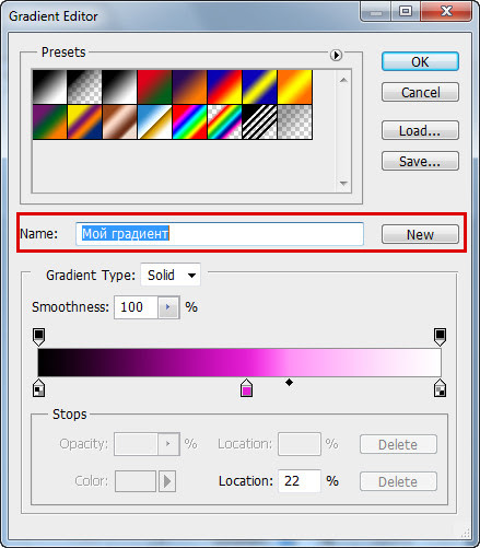 Кроме того в редакторе градиентов можно загрузить готовые градиенты, найденные на просторах Интернета.