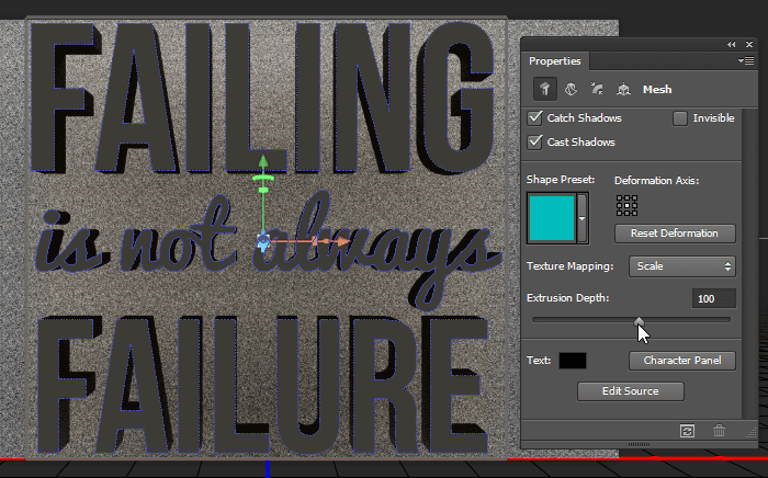 Теперь вы можете выдавить текст в 3D.Перейдите в 3D> Новое 3D-выдавливание из выбранного слоя. На панели «Свойства» щелкните «Сетка», выберите «Отображение текстуры: масштаб» и установите для параметра «Глубина выдавливания» значение 10 мм. На панели 3D нажмите Safari_Texture Front Inflation Material, установите Roughness на 80% и Bump на 100%.