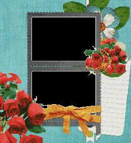 Коллаж в виде почтовых марок на бирюзовом листке бумаги, перевязанных оранжевой ленточкой, украшенных букетами красных кустовых роз. В эту png виньетку можно разместить две фотографии подходящие по стилю.